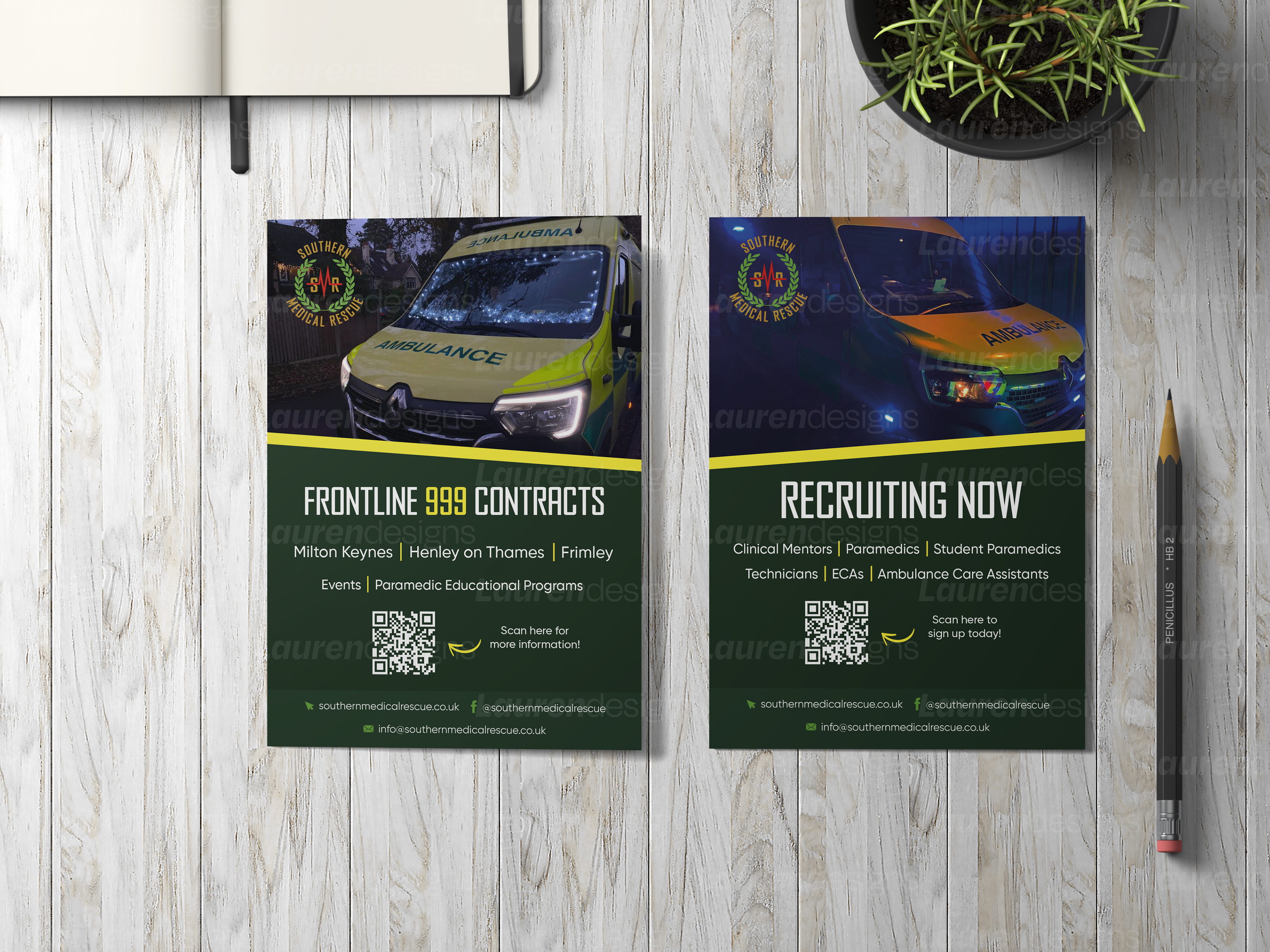 Multiple publications were designed for a private ambulance service aiding the NHS. This consists of stickers, flyers, business cards and other promotional material.